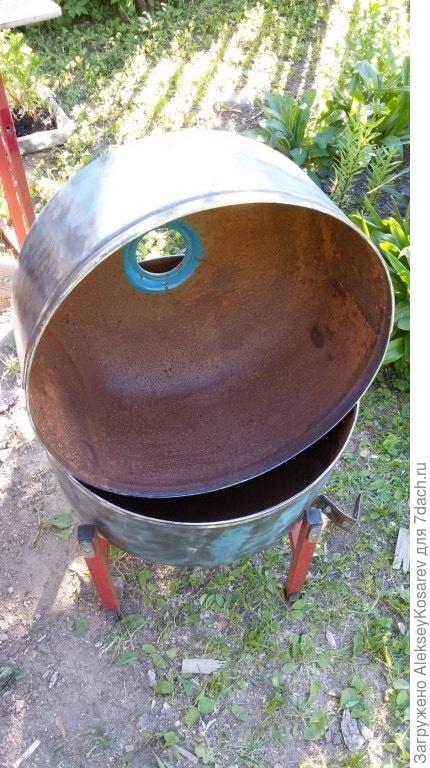 Бак можно было бы распилить и по-другому, вдоль. Тогда можно чашу и крышку соединить при помощи петель, сделать крышку откидывающейся, а не снимающейся, как у моего. Такая форма позволила бы размещать большее количество шампуров, если надо. Но, повторюсь, мангал у меня уже есть. Петли возможно использовать и в моем варианте. Думаю, что это будет не очень удачной идеей, т.к. крышка в ветреную погоду перевесит и опрокинет мою конструкцию. Я остановился, на чем остановился.