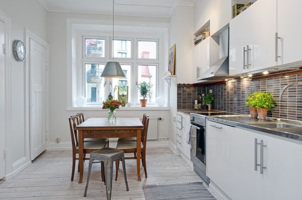 Скандинавский стиль – прекрасное решение для привычных нам небольших кухонь, поскольку обеспечивает не только уют, но и функциональность комнаты. При этом обеспечивается максимальное количество света: занавески не приветствуются, а светильники используются на всех уровнях (нередко присутствуют даже торшеры).